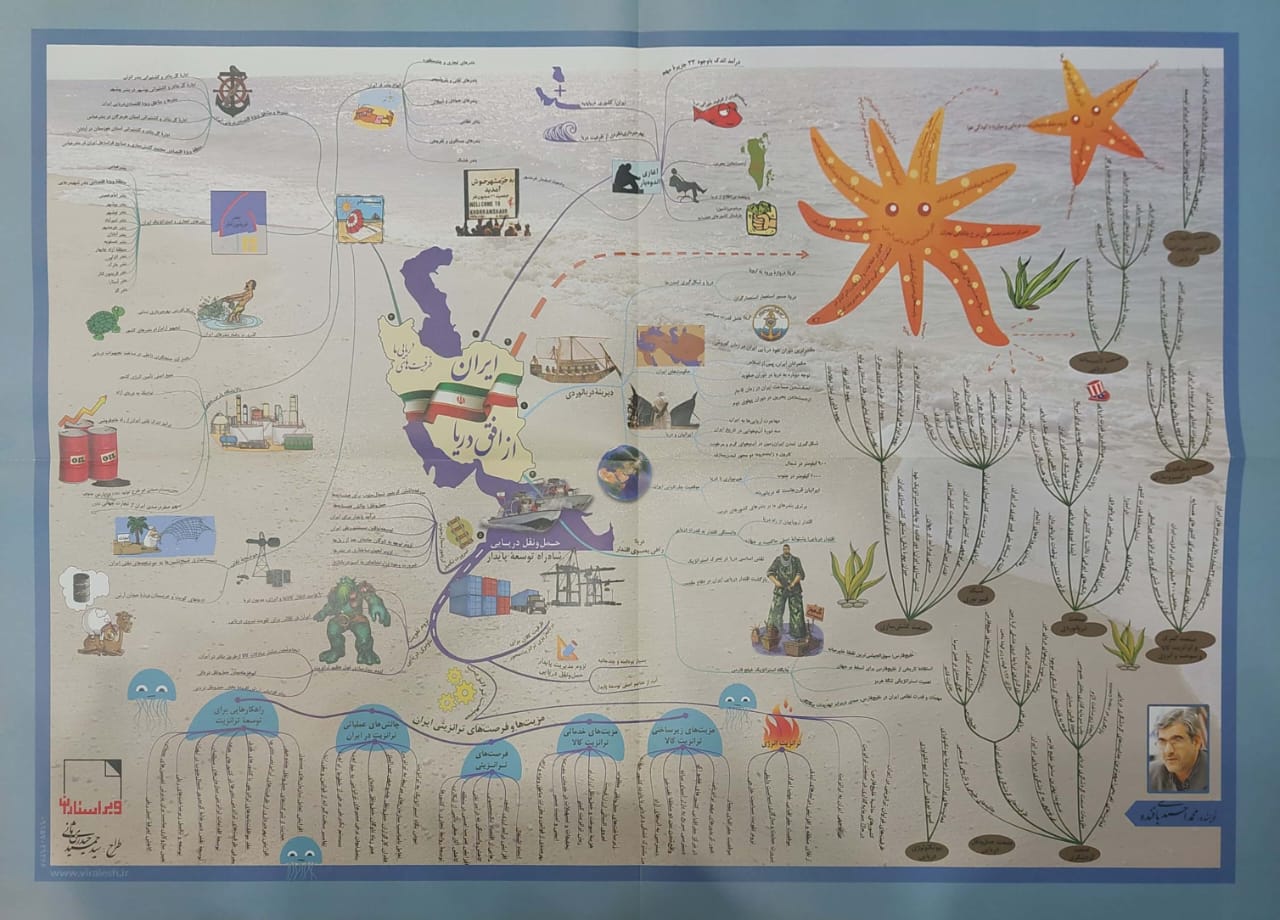 2- کتاب ایران از افق دریا با یک پیوست نقشه ذهنی را در سال 1392 جهت معرفی ظرفیت های دریایی ایران به چاپ رساندم که مقدمه ایی شد جهت تدوین کتاب های حمل و نقل و لجستیک.